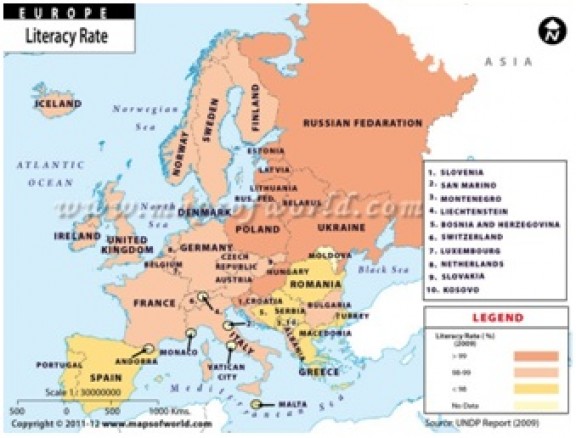 Map showing the impressive literacy rates of the numerous countries of Europe.